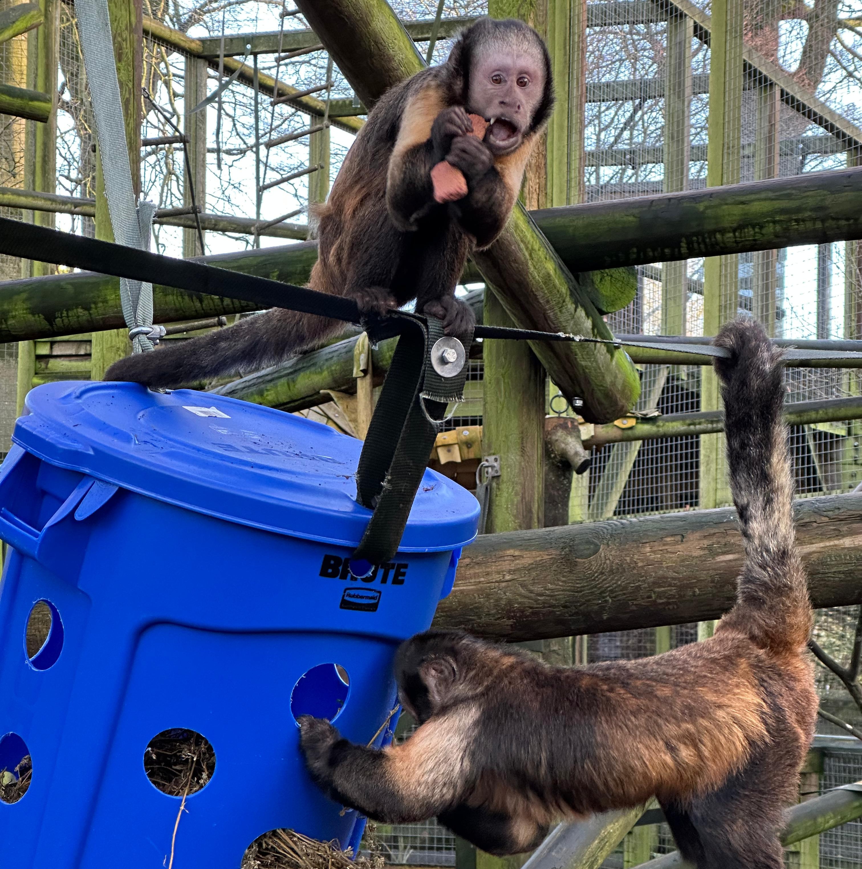 Using a circular drill, the team cut large holes into BRUTE® bins, then filled them with hay and the monkeys’ favourite foods. It encouraged the geladas and capuchins to get their food in a more enriching way, meeting both their physical and mental needs.