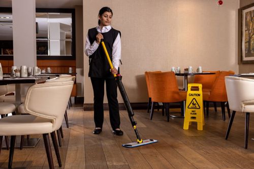 Tomemos como ejemplo nuestro kit de mopas HYGEN™ PULSE™. Este sistema no solo necesita menos agua, sino que limpia más superficie en menos tiempo, es decir, de manera más eficiente y rentable. En un sector en el que la higiene es tan importante, es indispensable utilizar la mejor mopa de microfibra del sector, una microfibra de alto rendimiento de 3 a 5 micrómetros de densidad, que elimina más polvo, suciedad y microbios que los productos de limpieza convencionales. Está demostrado que las mopas húmedas de microfibra no solo limpian un 45 % más que las fregonas de tiras y un 25 % más que las mopas convencionales, ya que pueden lavarse y reutilizarse muchas veces, sino también que, como en el caso de Sanctuary, la implementación del sistema HYGEN™ PULSE™ evita tirar a la basura hasta 400 kg de cabezales de fregona.